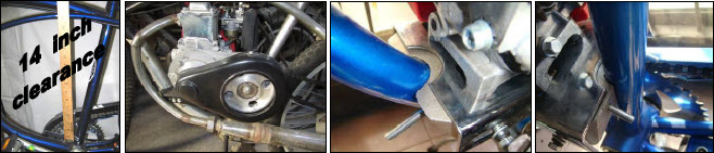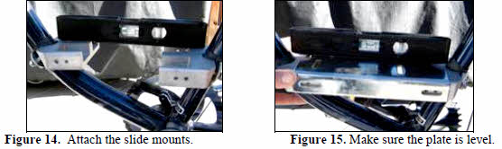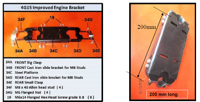 | Attach engine to bracket plate using M6 x 16 Socket Allen Hd. bolts included in your I-Kit. Remove 8 side bolts from the engine mounting bracket and separate the plate from the 2 end cast iron slide mounts. Attach the 2 slide mounts to the bike frame; (Figure 14.). If the frame down tube is too big for the slide mount opening, grind out the curvature and or you may need to remove, drill and tap to reposition the studs out ward. Make sure that the engine mounting plate sits in a level position (Figure 15.) and lines up with the side holes. Lift the plate off the mounts and install it on the bottom of the engine using 4 > M6 x 16 cap screws & washers. |