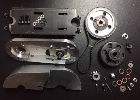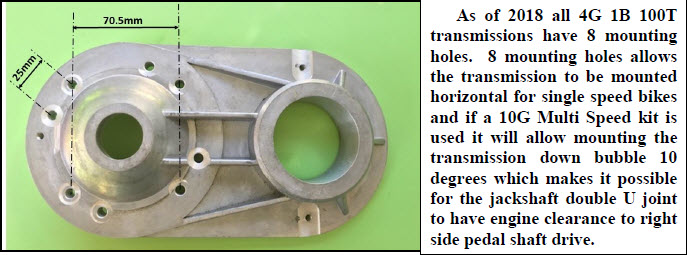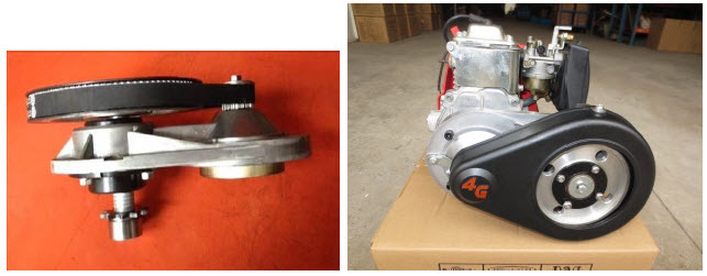 OPERATION: When the engine is at about 3000 rpm the 3 shoe centrifugal clutch on the crankshaft will latch up with the 20T pulley drum bell. The 20T drive pulley is supported on a shaft with 2 ball bearings. The 20T drive pulley on the drum bell transmits rotational torque to a larger driven pulley which can be either 80T or 100T. The driven pulley being affixed to a jackshaft then transmits engine torque to a drive chain sprocket which can be 9T or 10T. A heavy duty 415 size chain drives a rear bike wheel sprocket which can me 44T, 48T or 56T. The driven pulleys on all 4G-1A, 4G-1B and 4G-2D transmissions have an integral Freewheel Assembly that allows easy pedaling while in engine off people pedal mode. |