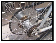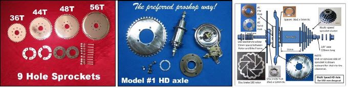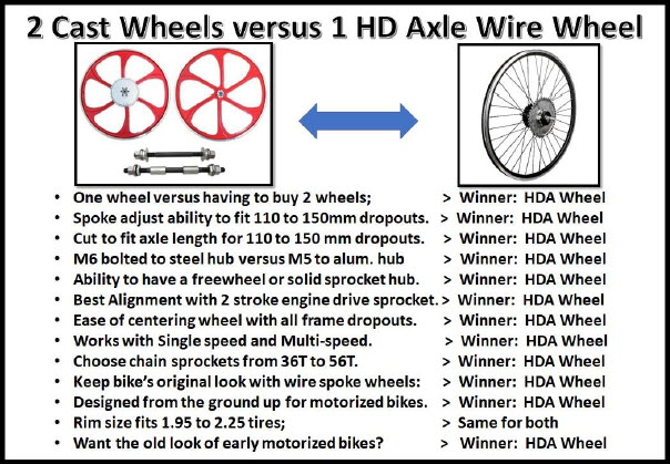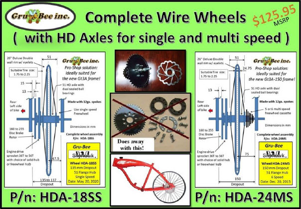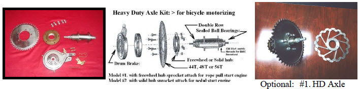 Optional Gru-Bee HD Rear Axle Kit Model #1 with freewheel flange made for attaching 44T, 48T or 56T sprockets. HD Axle #1 allows the wheel drive sprocket to be bolted directly to a freewheel hub that screws on the HD axle with CCW threads. Thus, Sprocket to Spoke clamp installation is eliminated and allows bike pedaling engine off without any chain restriction. HD axle wheels prevents broken spokes and gives true alignment for a pro-shop set up: HD Axle has sealed ball bearings with double row balls to ensure long life and heavy duty operation. NOTE: Using the optional dual brake cable throttle allows for a 3 brake system. For hill climbing use a 9T Sprocket with 56T rear sprocket; For highest flat land speed use the 10T drive sprocket and 44T rear sprocket. Heavy riders use 10T/48T rear sprockets and hill climbers use 9T/56T. Going fast is not a good idea if your bike has poor brakes, worn tires or if you are an inexperienced rider. |
