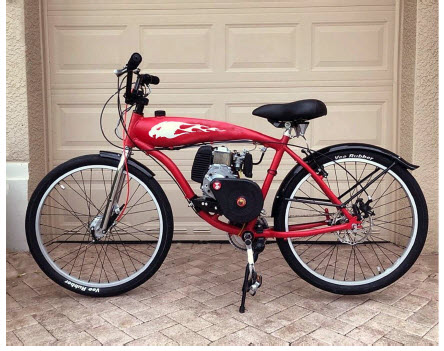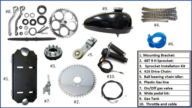 This is a DO IT YOURSELF PROJECT: Mechanical Aptitude is Required: Please do not attempt this project if you do not have a good understanding of gasoline engine maintenance, hand tool usage and mechanical mechanism operation. It is common belief that most laws stipulate that a motorized bike with an engine less than 50cc; having less than 2 hp and going no faster than 30 mph is legal to operate without license, registration, or insurance. For complete legal details you should contact your local state authorities as we cannot be responsible for knowing all state and local laws….. |