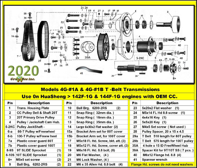 4G Model 1A and 1B Trans. fit HuaSheng 142F-1G 49cc & 144F-1G 53.5cc engines: These 2 HuaSheng engines come with a reliable 3 shoe centrifugal clutch on a tapered shaft.