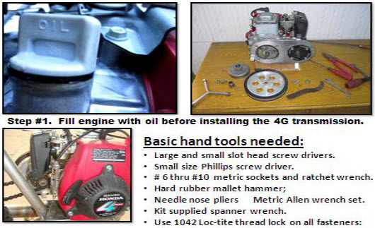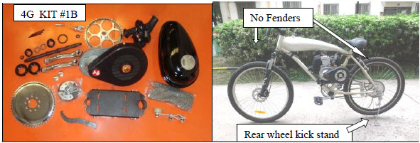 | Disclaimer Note: Please remember this is a DIY Parts Kit made for adults for use with a HuaSheng engine as hobby or for personal pleasure: Failure to understand or carry out installation instructions is not the responsibility of the components manufacture nor of the selling distributor or dealer. Common Sense, Engine Knowledge, and Mechanical Aptitude are required along with a love passion for small engines and motorized bicycles. Field Modifications to install and operate may be necessary. The end user or assembler must take self-responsibility of his own recognizance to design and make his own finished product. Operating a motorized bicycle involves risk of bodily injury. Buyer accepts full responsibility for any and all vehicle operations that may lead to personal injury, economic loss, social distress, other losses, costs and damages. Neither China GAS,/ Gru-Bee inc. nor the selling WD Distributors can be held responsible for injuries and / or damages resulting from operating a motorized bicycle with this engine installation kit. This kit is not recommended for use by persons under 16 years of age. Obey all traffic regulations. Always wear a helmet while riding. Remember that you are riding a motorized bicycle and other traffic may not be able to see you. Never operate your motorized bicycle on a pedestrian through way or sidewalk while the engine is running. Never operate your motorized bicycle in an unsafe manner. Check local and state laws before riding on state highways or city streets. A rewarding and joyful challenge can be found in designing a custom installation of your own. Remember, a quality installation is paramount to safe usage and your long term satisfaction. You may find many uses for this 4G Parts kit from stationary machinery to off road go-carts. Have fun and good luck: |
