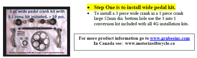 | A cruiser bike with a 28 to 38mm dia. front down tube and a 28mm dia. seat tube works best. Be sure to have a mid-frame kick stand or a rear wheel lift kick stand so the rear wheel can be up when staring the engine. Running the engine with wheel up allows for a spinning wheel engine warm up. Old style 26” Crusier type bikes with heavy steel frames work good. Do not use a bike with wheel fenders as attach struts can come loose and get jammed in the spokes while riding causing rider injury. Your 4G Kit includes a Wide Pedal Crank with 3 in 1 conversion that allows installation into 52mm dia. large bottom holes made for a one piece crank or can also fit small bottom holes made for a 3 pices pedal crank. It is essential that your donor bike have both front and rear brakes for safe operation but a disc brake on the rear wheel cannot be used. Using a bike with a coaster brake is not recommened because if the pedal chain breaks you have no brake. Do not ride with inadequate brakes! The doner bike needs at least 14” clearance between bottom hole and top tube. Do not use bikes with cheap made axles and front forks. Do not use wheel fenders as they can cause danger if they come loose and the stays get intangled with spokes causing rider to enjoy a flying leap over the handle bars. Speeds in excess of 25mph is not recommended due to a bicycle’s lightweight inherent design.. The smaller the rear sprocket the faster the top speed. Going faster than a bicycle was designed to go is foolish. #1HD or #2HD axle kit is recommended for more lasting endurance. When riding always wear a helmet and abide with local and state laws. Remember, you are the designer and assembler of your own motorized bike so use good engineering practice and common sense when making your component selections and applications to a donor bike. The end user or the installer becomes the prime vehicle manufacture and accepts all laws of the land which includes product liability. Do not use or buy this product if you expect otherwise. |