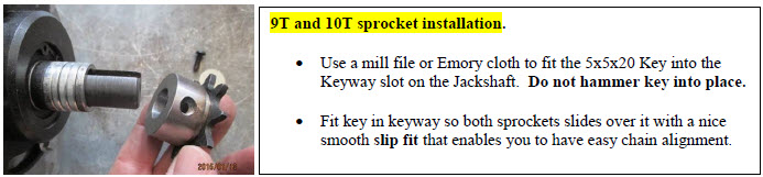 Step 6. CHAIN ALIGNMENT; 9T and 10T slide sprockets can be moved by repositioning the spacers on the output shaft from outboard side to inboard side to allow perfect chain alignment. Tighten set screws. Use 242 Loctite. |
