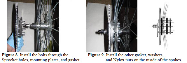 | First step will be to disassemble the sprocket mounting assembly included with the kit. Apply a light coat of grease or anti-seize compound on fastners. This will keep water and salt out of the threads and allow for easier removal of the sprocket mounting assembly in the future. Hold the engine drive sprocket with the concave side facing you and push the bolts through the holes. On the convex side, fit the set of three bannana mounting plates on the bolts. Then, fit a rubber gasket on the bolts (Figure 8). Place the sprocket assembly on the wheel. In order for the inside rubber gasket to go around the axle cut one side between the holes. . Reach inside the spokes and fit the gasket on the bolts. Install the 3 bananna plates first and then 2 half moon plates on top. Install lockwashers and nuts with a cross or star pattern tigthening process. You will find a ratchet and long extension helpful to do this. (Figure 9). |