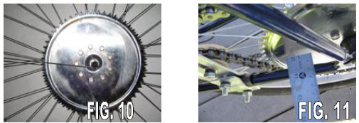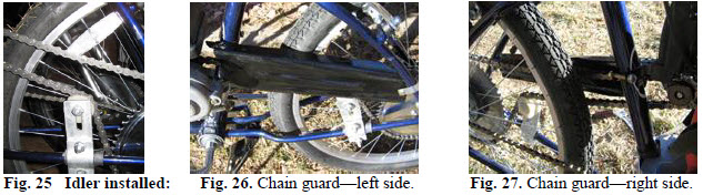 Adjust chain tension with chain idler mounted on bike wheel strut or chain stay. At middle span adjust to ½”” chain deflection. Install chain idler bracket with pulley on inboard side as shown; ( See Fig. 25 & Fig 26 ) |