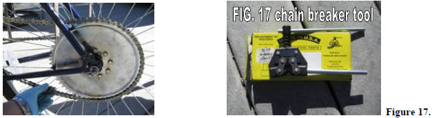 | You will need to estimate the proper length for the chain. The chain will need to be loose enough to slip off the rear sprocket, (Figure 16). You will want to be able to remove the chain later without having to remove the rear wheel. When the chain tensioner is installed, the chain will not slip off on its own, assuming everything is aligned properly. Keep in mind that the chain will be one link longer when the master link is re-installed. Once you have decided on a chain length, mark the link to be removed. You can use a "chain breaker" tool (suitable for and HD 415 chain) to remove the link. (see Figure 17 ). |