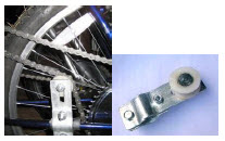 | Install the master link on the chain. Push the master link (with pins) into the chain from the left side of the bike. Install the idler or chain tensioner. Make sure that the chain tensioner wheel rides on the outside of the chain as shown in the photo #25. If you install the chain tensioner wheel on the inside of the chain loop, the chain will pull away from the sprocket, and slip off. The chain should move about ½” up and down from a point midway between the seat tube and rear wheel. It should not bind excessively when the rear wheel is turned. If it binds, check the chain tension and sprocket alignment. Do not start the engine until you can rotate the wheel by hand without the chain binding or slipping off. A binding chain under full load can break sprocket teeth or cause other damage! |