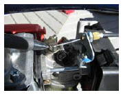 Carb. Cable and Choke Hook Up: Hook up the throttle cable to the throttle arm on the carburetor as shown. Ensure that the throttle arm returns to the idle position after you let go of the throttle grip. The idle position is when the throttle arm touches the black plastic idle screw. Some engines differ in this area so field modification may be required on the part of the installing mechanic. Test Start engine without chain installed and tune rpm to optimum idle condition to ensure centrifugal clutch is not engaging at idle speed; To start: set choke; and open air cleaner baffle lever and pull on rope: After starting progressively remove choke and let warm up. After test starting, kill the engine and proceed to complete the installation process. If engine fails to start check fuel line; ignition spark and kill switch; |