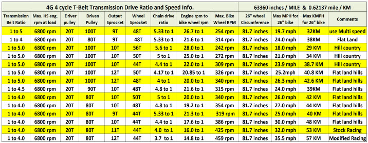 | To calculate final drive ratio you have one constant, the 20T belt drive pulley; Divide 20 into the driven pulley’s number of teeth. ie: 80/20 = 4 Divide the jackshaft output drive sprocket number of teeth number into the rear wheel sprocket teeth number. ie: 48/10 = 4.8 Now multiply both quotients together, ie: 4 x 4.8 = 19.20 to one. |